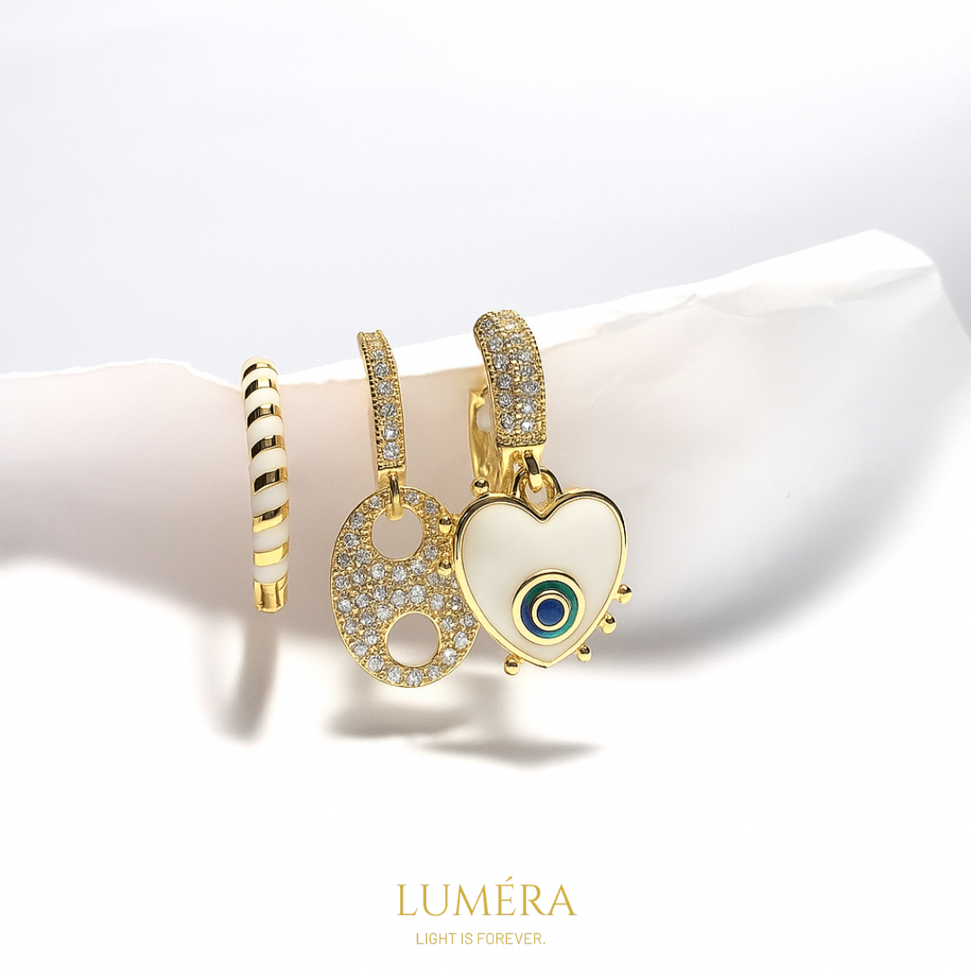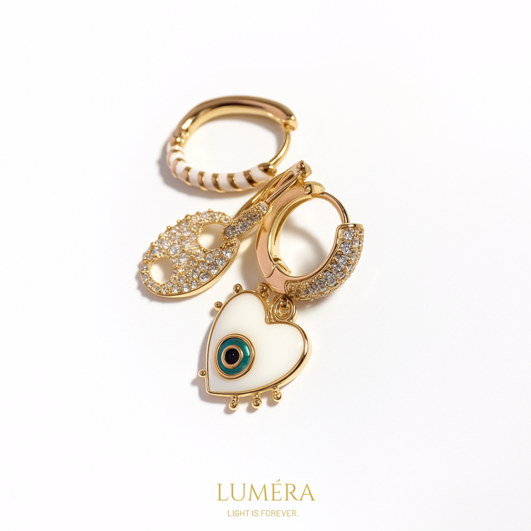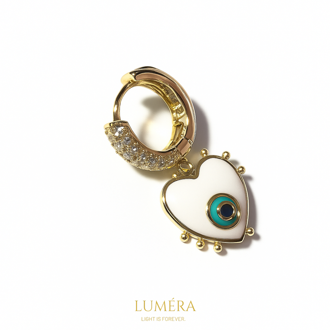 Altın Detaylı Nazar Gözlü Kalp Küpe Seti – Luméra