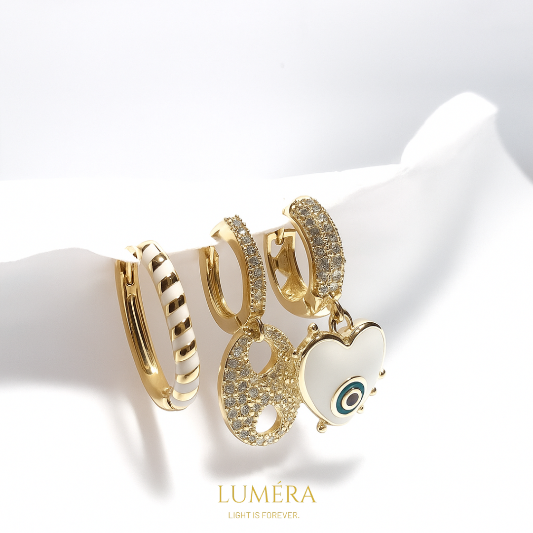 Luméra’nın Altın Detaylı Nazar Gözlü Kalp Küpe Seti, modern zarafeti ve sembolik anlamı bir araya getiriyor. Kalp formundaki nazar göz detayı, hem koruyucu hem de şık bir dokunuş sunar. Parlak taşlarla bezeli altın tonlu tasarımı, günlük stilinize ışıltı katarken özel günlerde dikkat çekici bir tamamlayıcı olur.